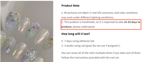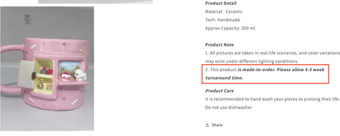 For instance, a handmade ceramic cup might take 4-5 weeks to produce. If you chose the standard shipping method costing $6.99, which takes 12-20 business days, you can expect to receive the cup in about 44 to 63 days.