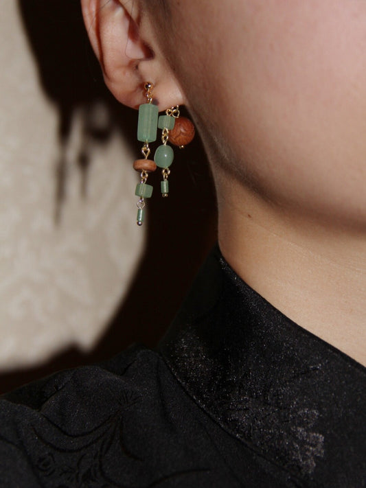 • 「Chinoiserie」 Natural Jade Sandalwood Beaded Dangle Earrings