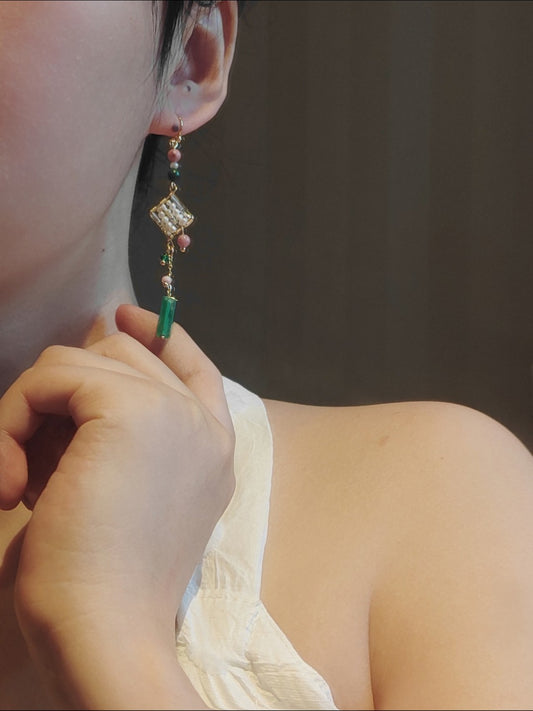 • 「Chinoiserie」Natural Jade Green Pink Beaded Drop Earrings
