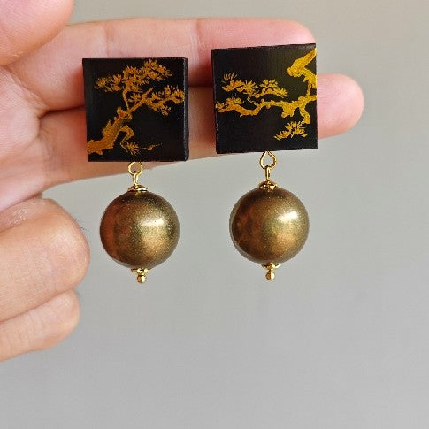 Chinese Lacquer Gold Pine Square Circle Earrings