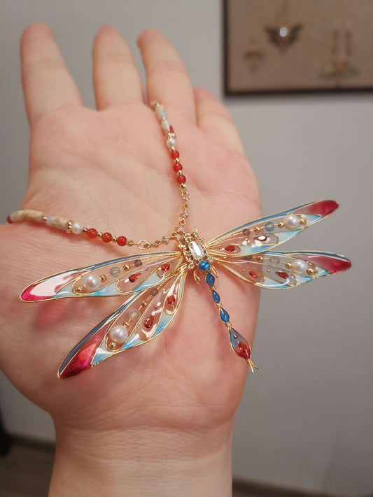 「 Chinoiserie」Red Blue Dragonfly Necklace