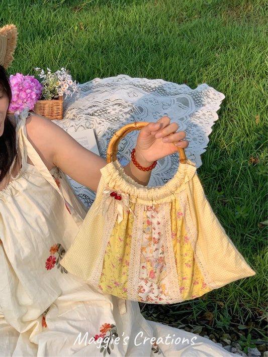 • Floral Printed Lace Forest Bamboo Handle Handbag