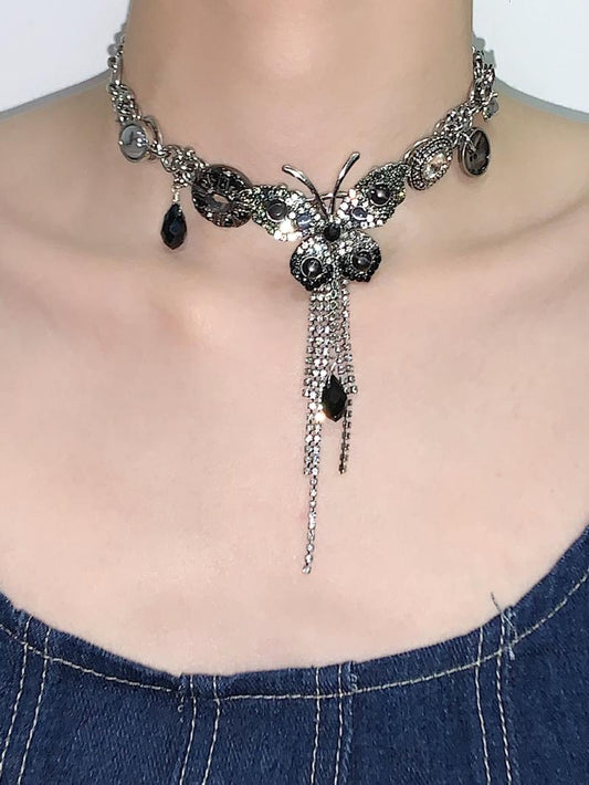 • Black Silver Butterfly Tassel Choker