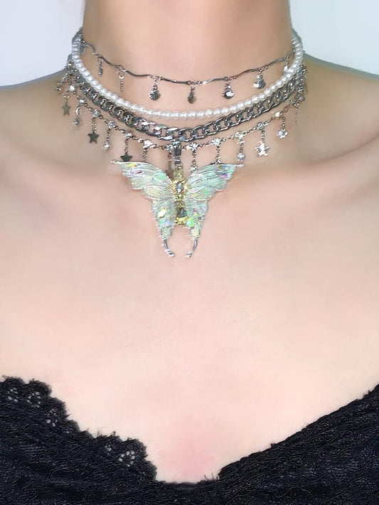 Green Butterfly Layered Tassel Choker