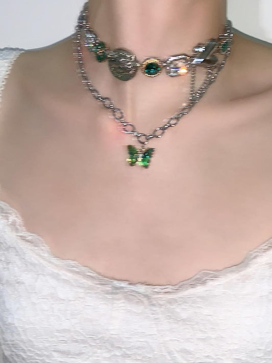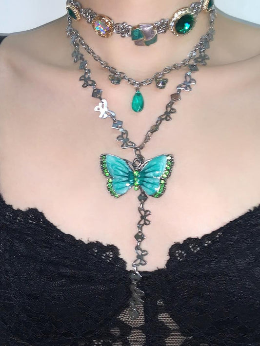 • Green Butterfly Layered Tassel Choker