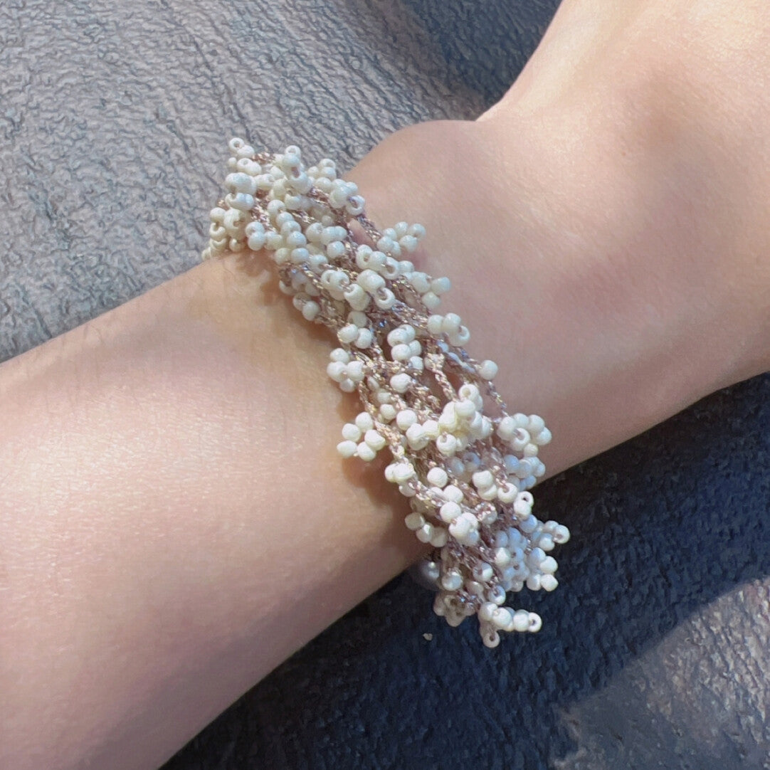 Delicately handmade, these earrings blend fine seed beads with intricate crochet work, creating a soft, romantic texture. Their refined craftsmanship makes them a lovely choice for bridal looks — light, elegant, and full of artisanal charm. Perfect for brides or anyone seeking a gentle, handcrafted touch for a special day.