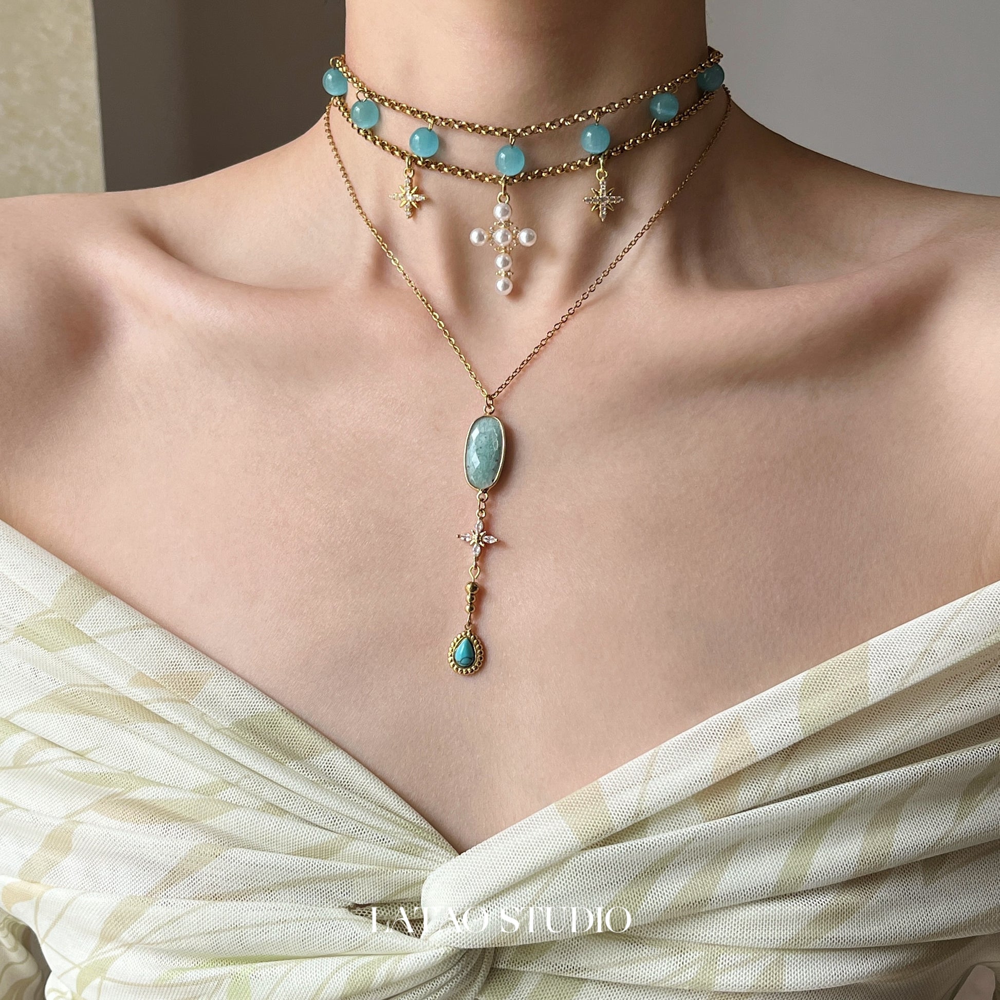 Material:  Coppering, Blue Cat’s Eye, Amazonite, Artificial Pearls, Titanium steel