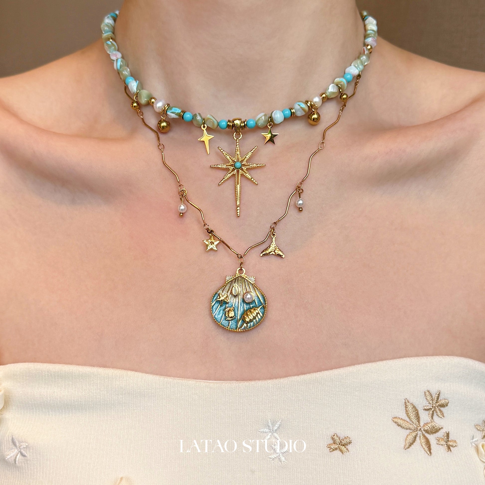 Blue Gold Shell Star Beaded Layered Necklace
