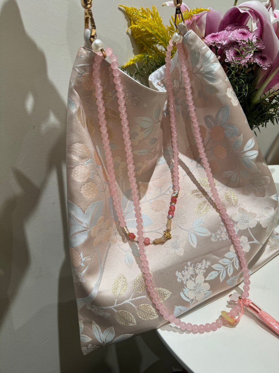 [Chinoiserie] Light Pink Lychee Pattern Beaded Tassel Silk Bag