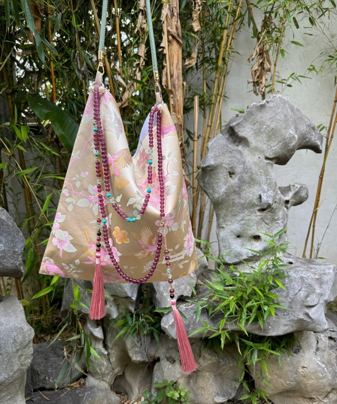 [Chinoiserie] Luxury Peach Blossom Magpie Purple Beads Tassel Silk Bag
