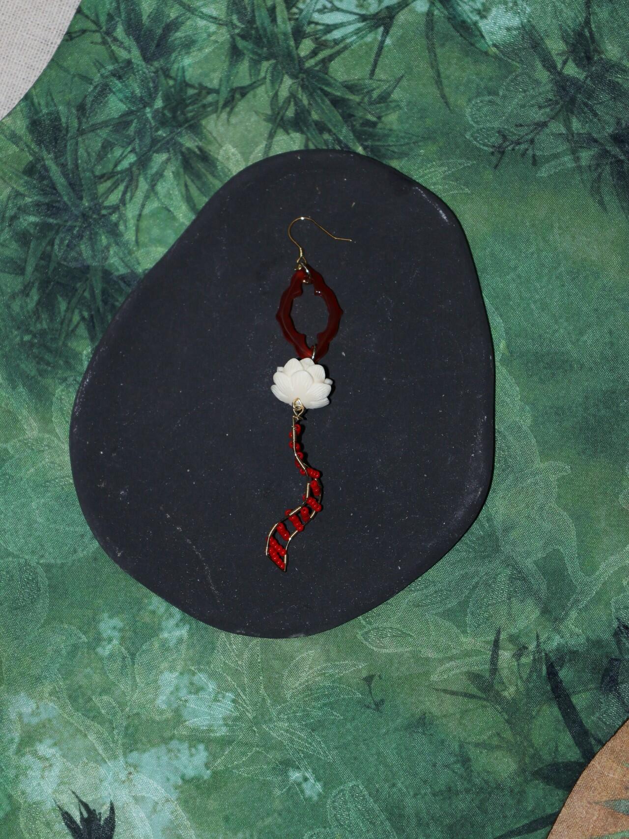 These earrings are inspired by Ne Zha, a popular Chinese animated movie. The lotus flower is one of the elements of the Chinese style, and the final angle and shape of the red armillary sash shows vigorous vitality.