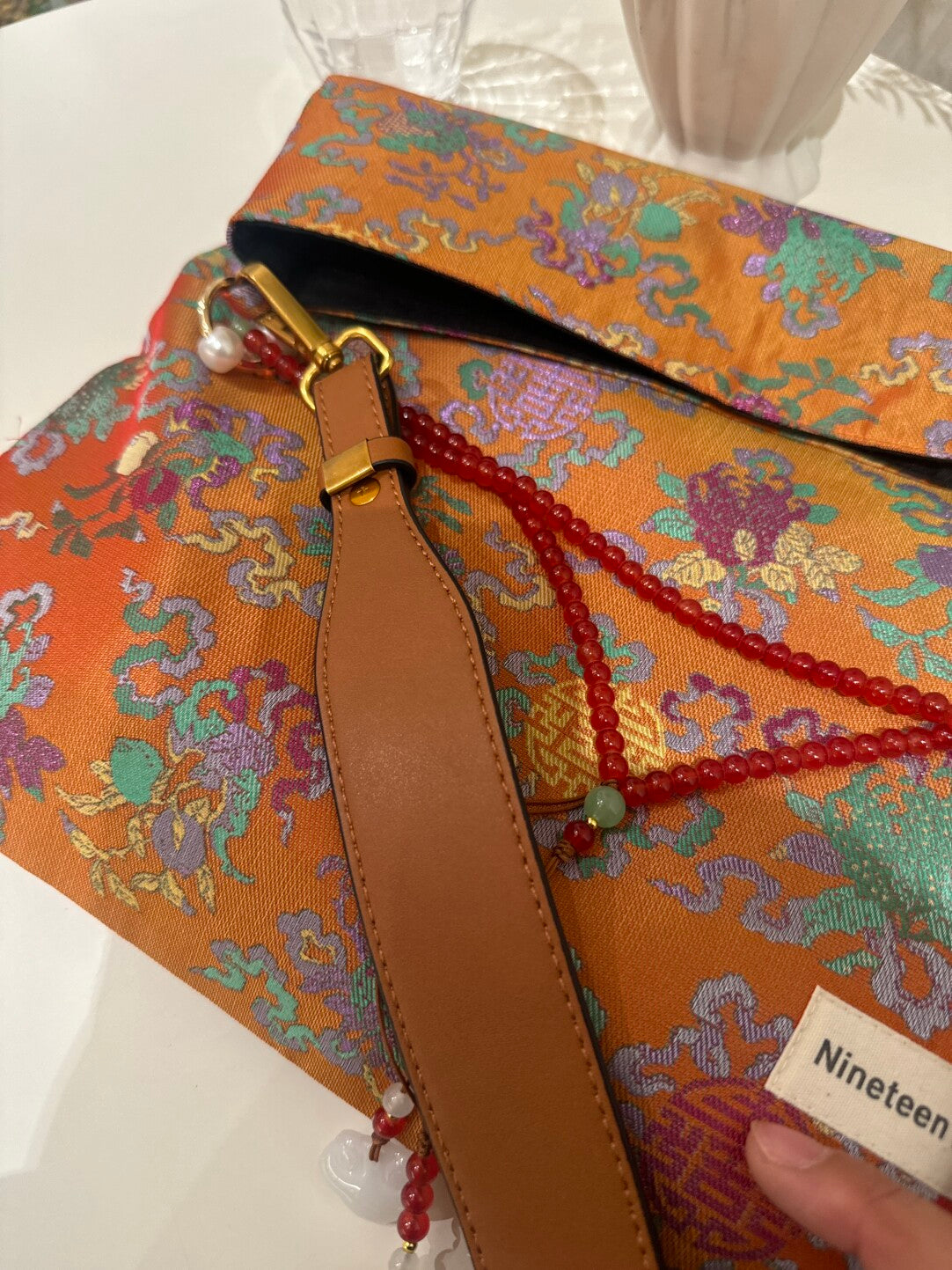 [Chinoiserie] Orange Auspicious Pattern Beaded Tassel Silk Bag