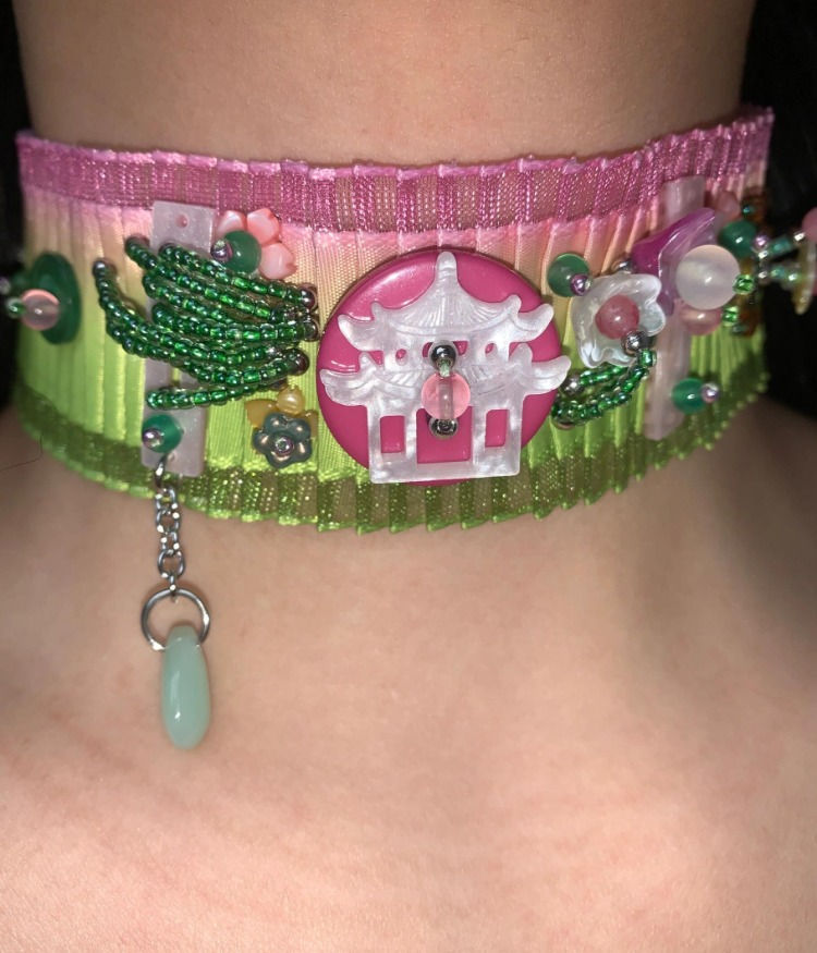 This Chinoiserie Red Green Beaded Wide Choker features hand-sewn beads on a vibrant red-to-green gradient fabric, beautifully adorned with traditional Chinese garden motifs like pavilions and terraces. Its unique design brings a playful touch of oriental elegance, perfect for making a bold and artistic statement.