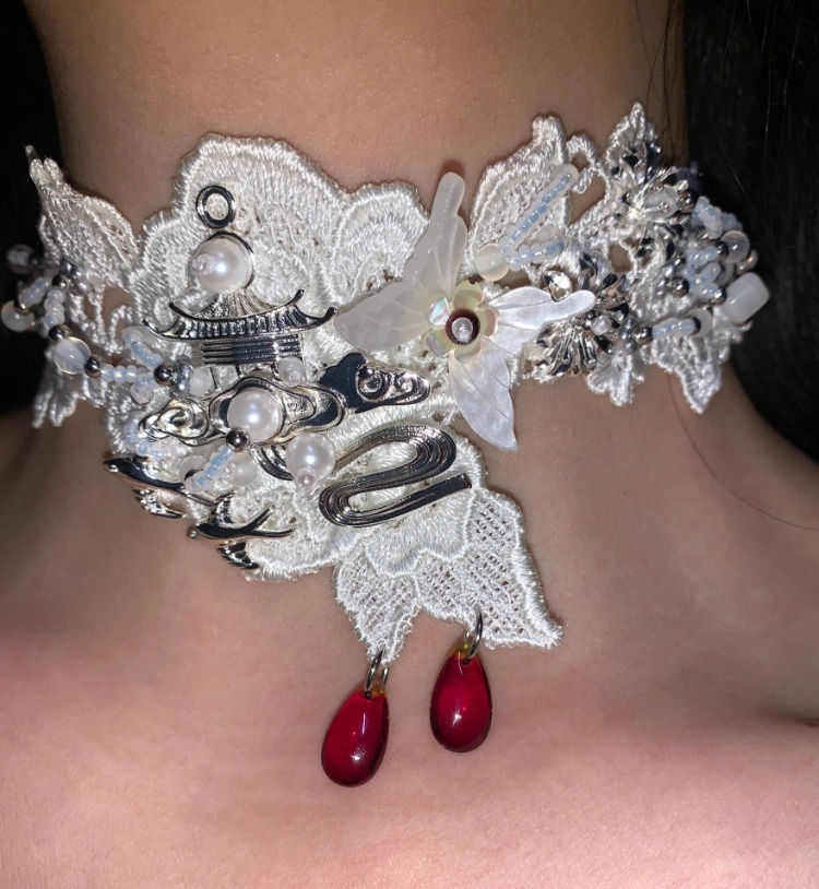 This Chinoiserie White Temple Red Beads Wide Choker showcases delicate beading on an irregular lace base, adorned with white butterflies, flying birds, and shimmering silver temples. Two blood-red teardrop beads dangle gracefully, creating a striking and enchanting accessory full of charm and character. Perfect for adding a playful yet elegant touch to your look.