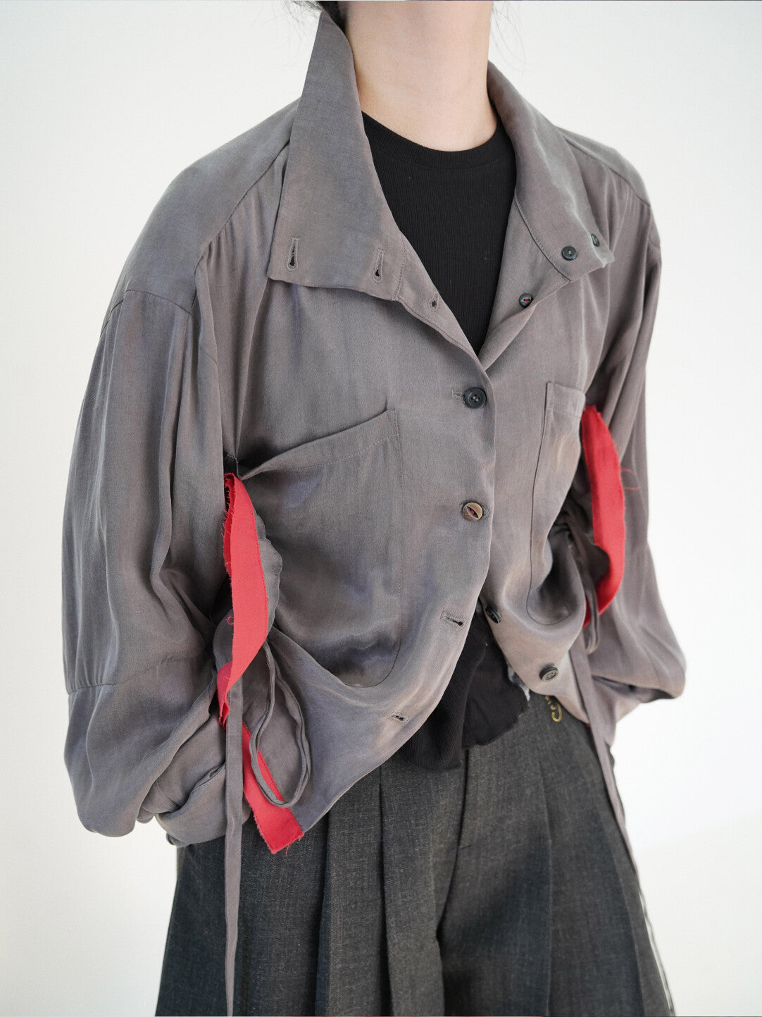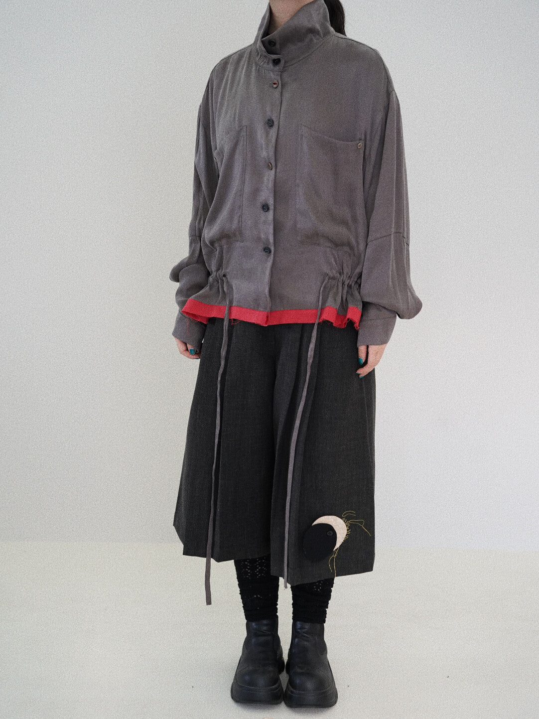 This playful outerwear masterpiece pairs a sleek gray base with a pop of red at the hem, creating an eye-catching color-block effect. The innovative drawstring system lets you transform it from a long coat to a chic mid-length piece in seconds—style flexibility at its finest. Quality buttons add sophisticated detail, while the fabric drapes beautifully for an effortlessly polished look. Whether you're dressing up or keeping it casual, this versatile piece brings personality and movement to any outfit.
