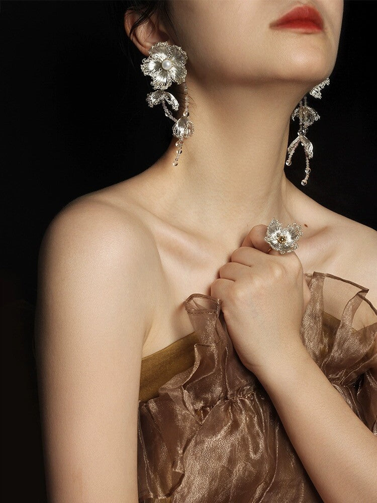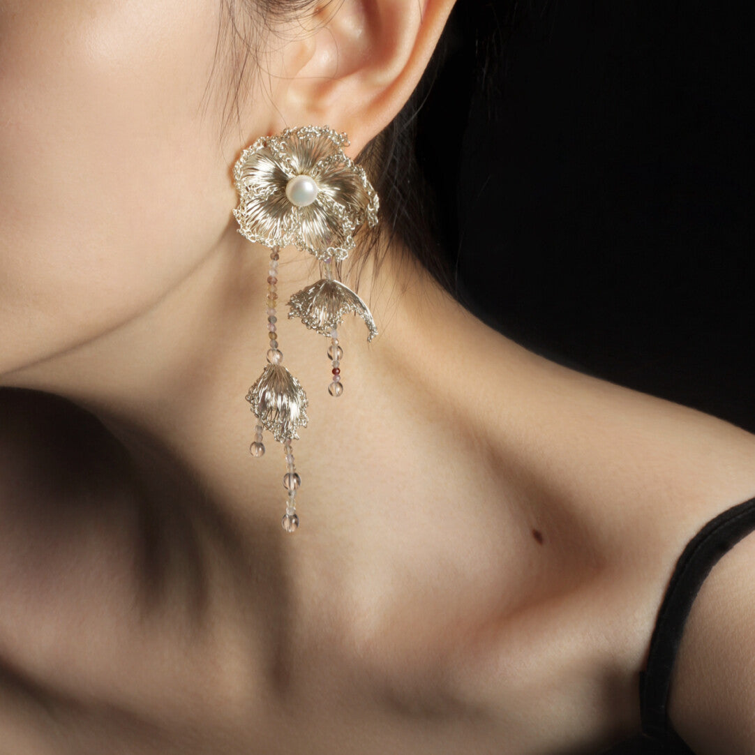This design is inspired by hawthorn flowers in spring. The designer carefully crocheted it to capture the softness and agility of the flowers. The auralite tassels hang down and sway gently with your steps, adding an elegant touch to your outfit.