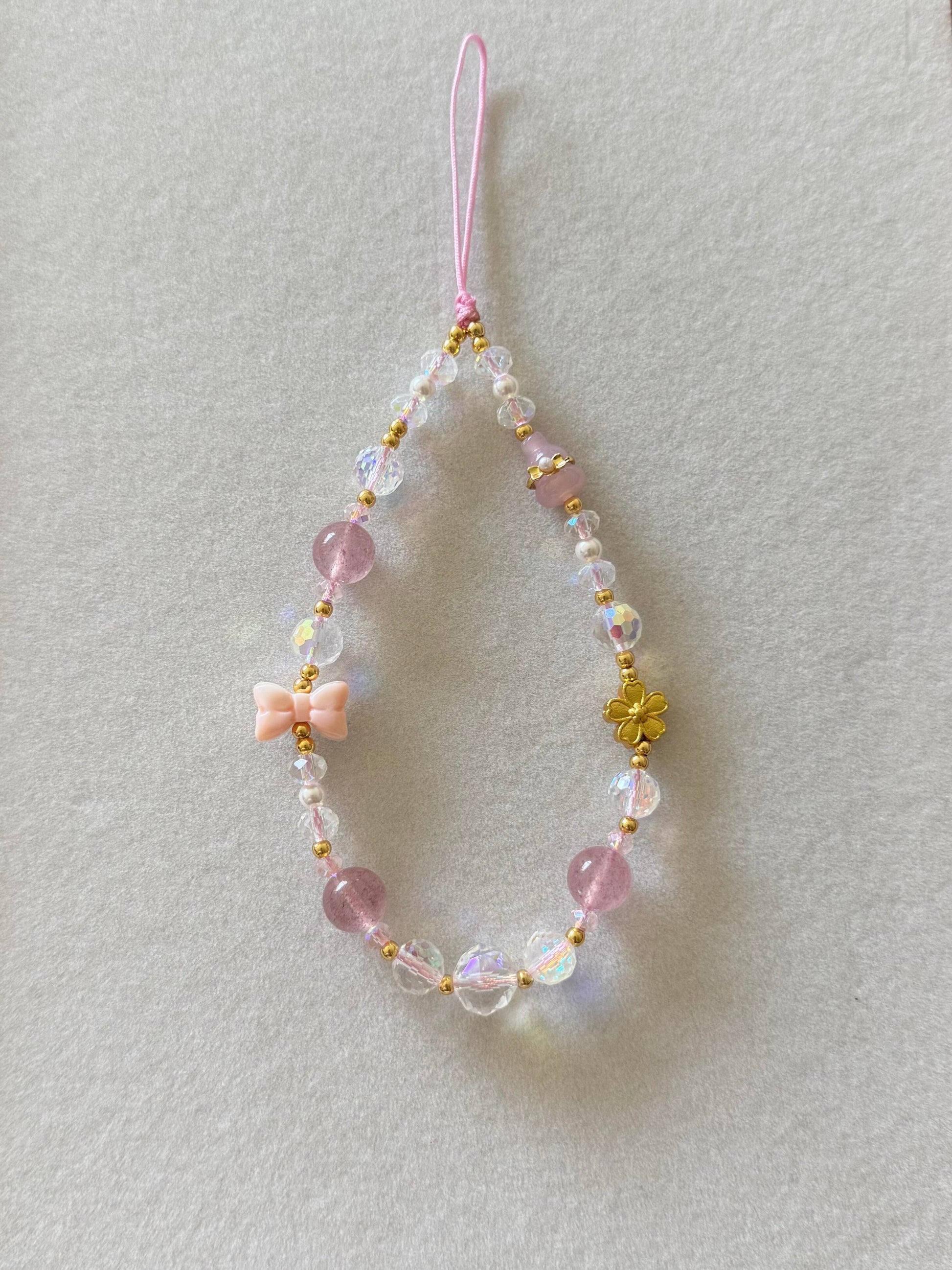 Indulge in elegance with this enchanting pink butterfly pearl charm, available in two delightful styles to match your mood. Crafted with gold plating and strung with delicate rose quartz beads and lustrous pearls, this accessory radiates feminine grace and sophistication. The graceful butterfly design symbolizes transformation and beauty, while the soft pink palette creates an irresistibly sweet aesthetic. Attach it to your phone case and carry a touch of magic with you everywhere. Whether you're treating yourself or gifting it to someone special, this charming pendant celebrates the beauty of nature and the joy of personal expression in the most delightful way.