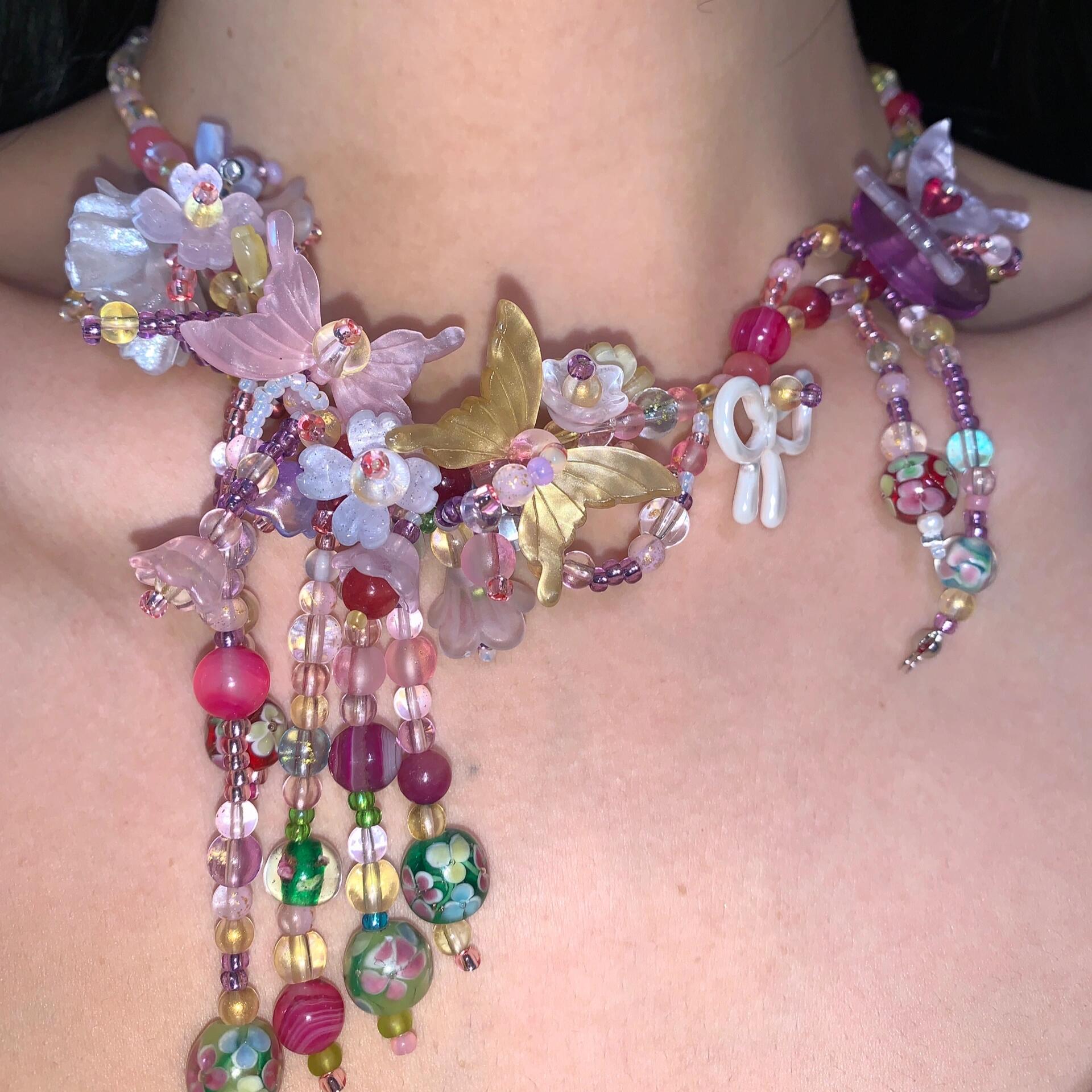 This Floral Bloom Maximalist Beaded Tassel Necklace is a stunning showcase of handcrafted beadwork, bursting with intricate flowers and fluttering butterflies. Its elaborate design captures the vibrant beauty of a midsummer garden in full bloom, making it a playful and dazzling statement piece for any occasion.