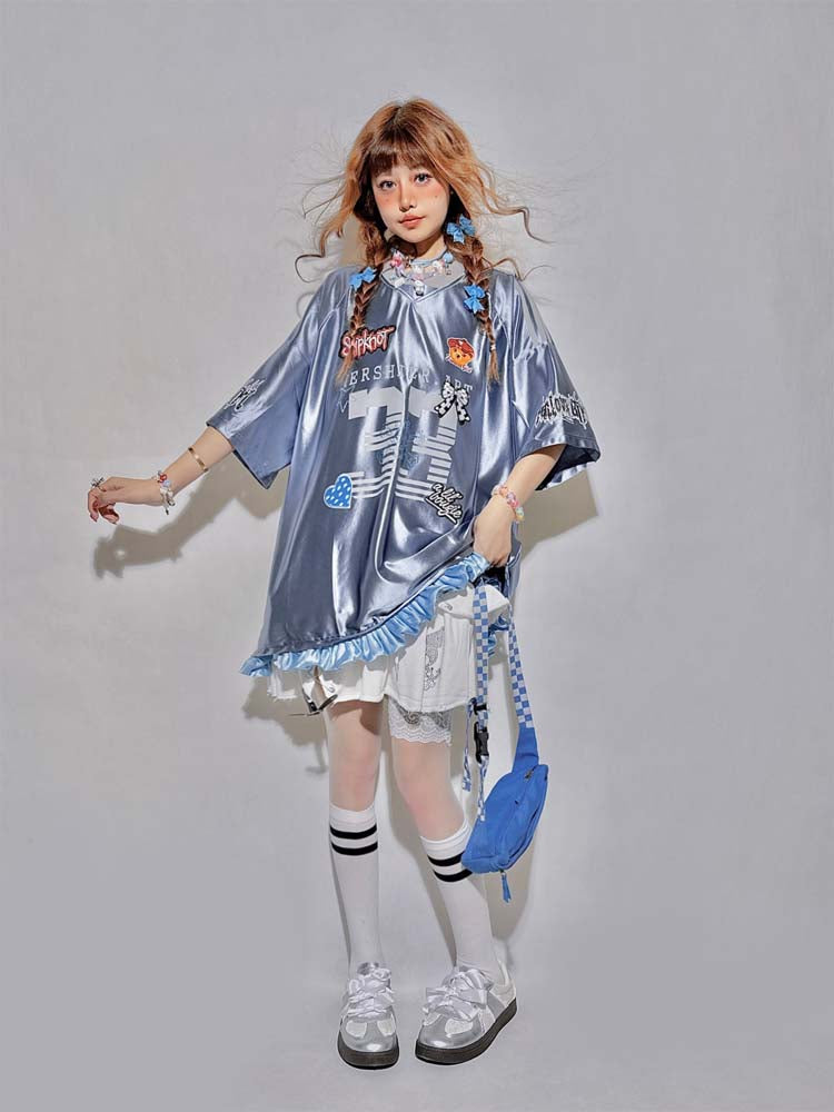 This Gray Blue Blokette Jersey brings a fun twist to sporty style with its shiny finish and oversized fit. The playful ruffled trim at the hem adds a cute, flirty touch that balances sweet charm with athletic vibes. Perfect for those who love to mix comfort and fashion effortlessly.
