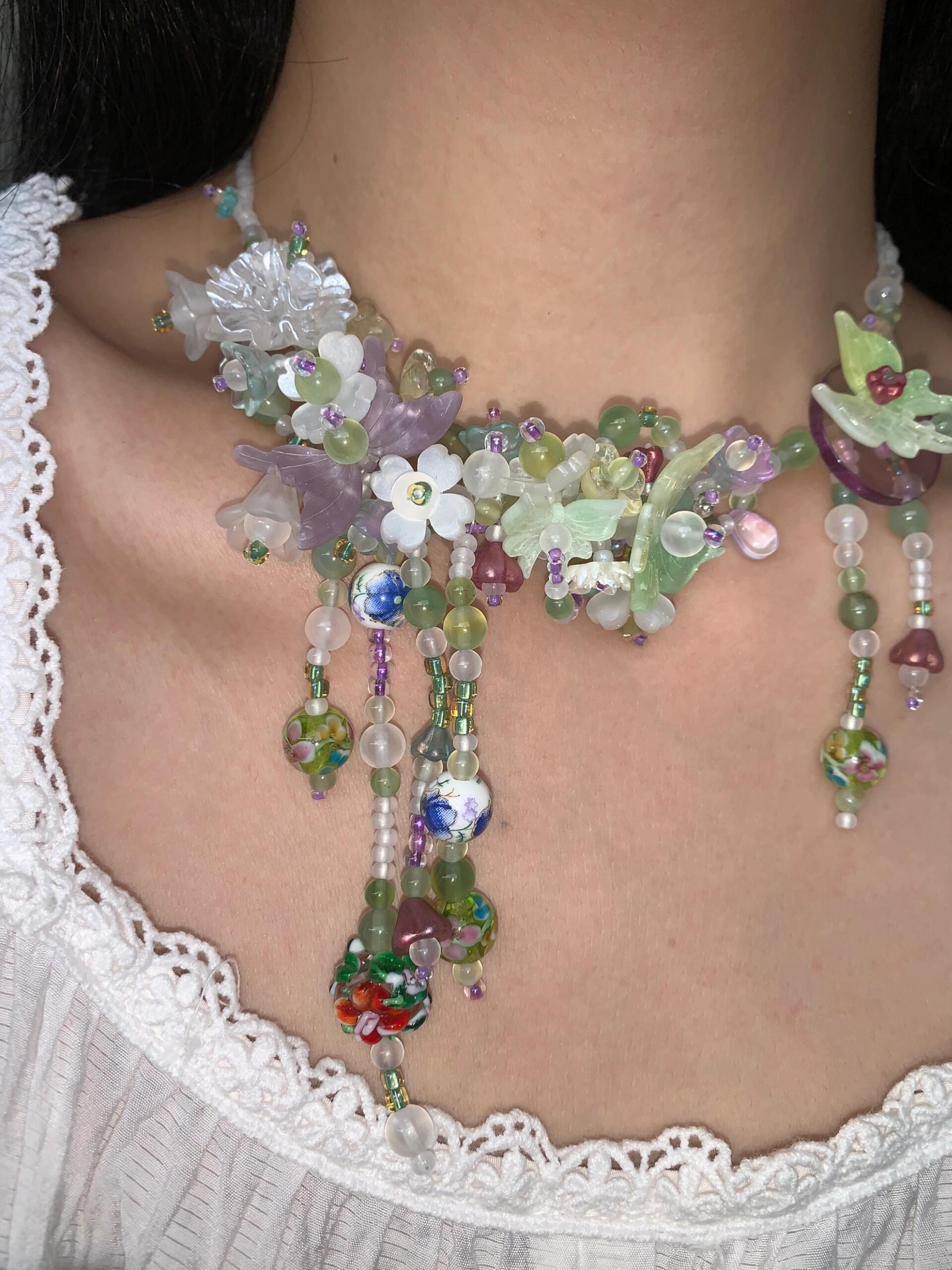 This Floral Bloom Maximalist Beaded Tassel Necklace is a stunning showcase of handcrafted beadwork, bursting with intricate flowers and fluttering butterflies. Its elaborate design captures the vibrant beauty of a midsummer garden in full bloom, making it a playful and dazzling statement piece for any occasion.