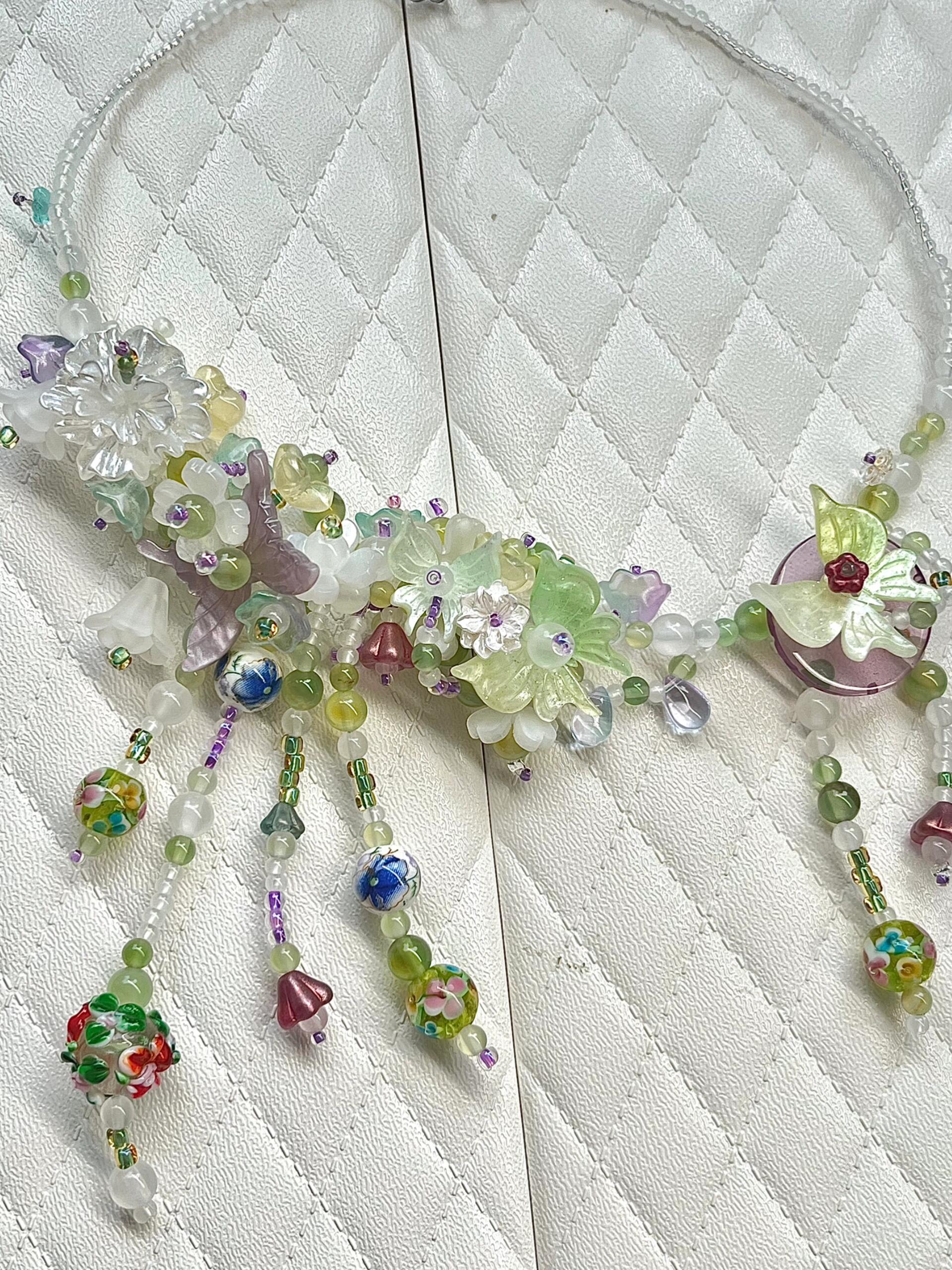 Green Floral Bloom Maximalist Beaded Tassel Necklace