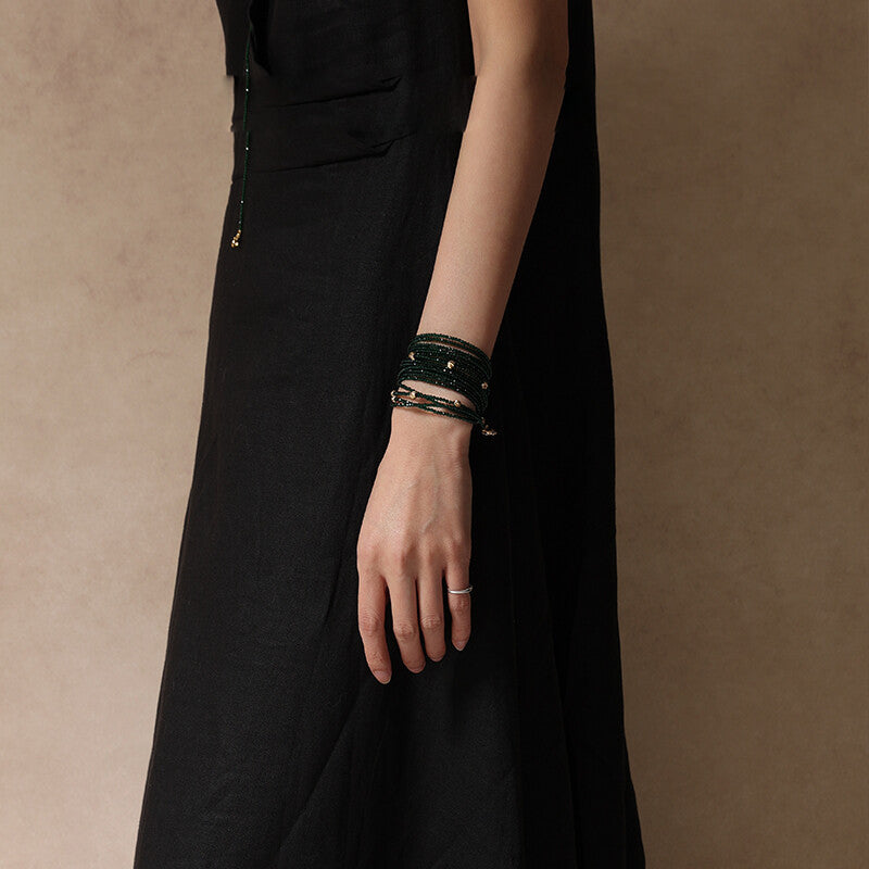 Handmade with copper alloy and vibrant green glass beads, this lightweight necklace stretches 282cm for versatile styling. Its rich emerald tones and layered design allow creative draping—wrap it as a multi-strand statement or wear it long for bohemian elegance. Perfect for adding color and texture to casual or artistic outfits.