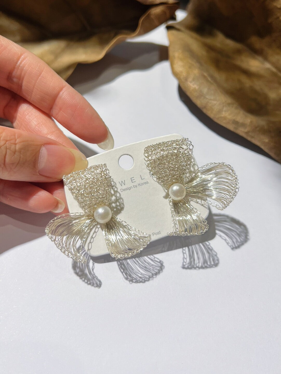 Crafted from intertwined copper and silver wires, these elegant earrings feature a delicately woven bow adorned with a luminous natural pearl. The fusion of metallic texture and organic glow creates a timeless piece—perfect for adding refined grace to both casual and formal styles.