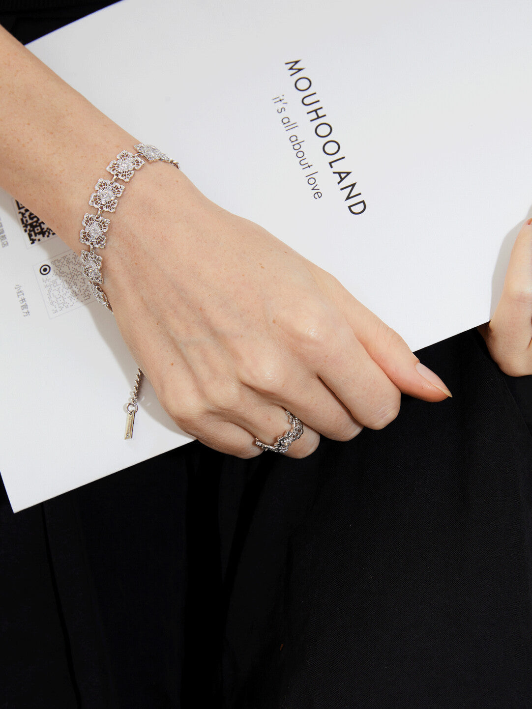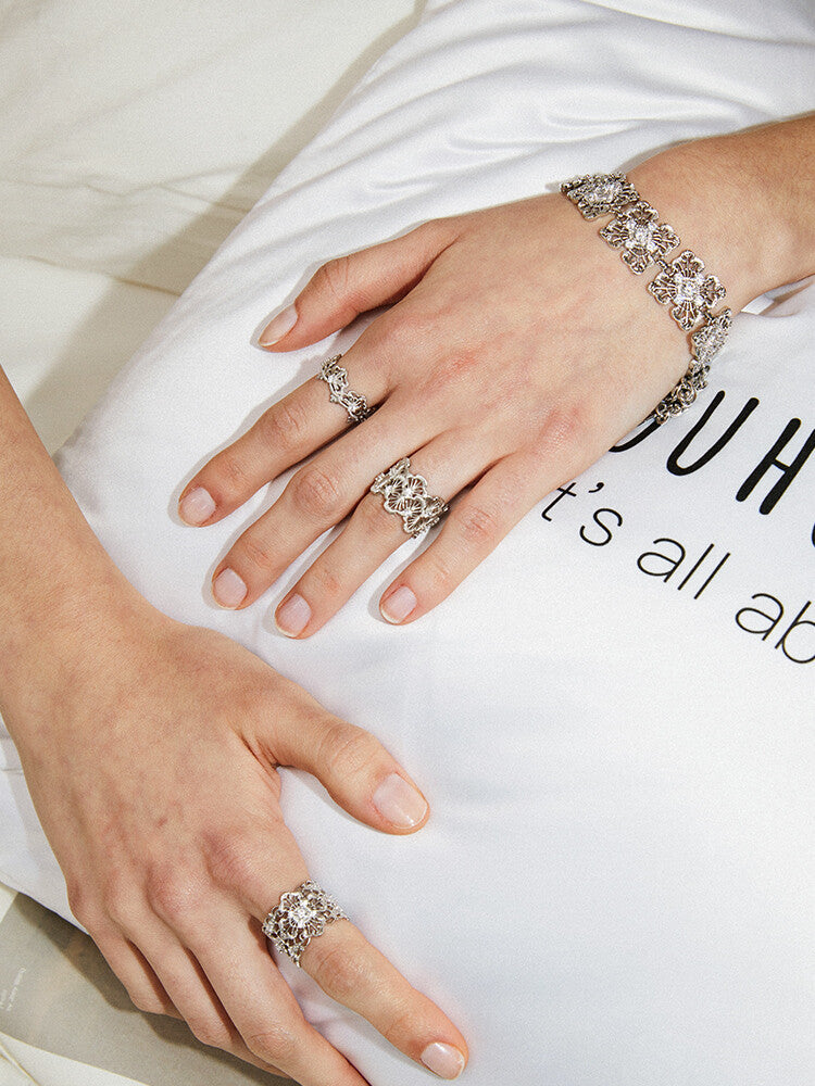 Inspired by the art of light and shadow in lace, this bracelet captures the delicate texture of embroidery through fine brushed silverwork. The lace-like pattern symbolizes both elegance and strength, reflecting a modern woman’s balance of grace and individuality.