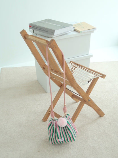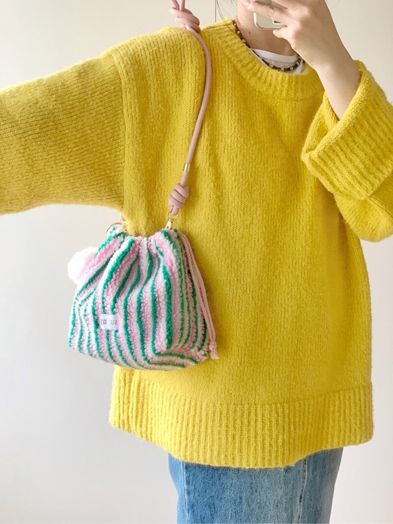 Plush Green Pink Striped Drawstring Crossbody Bag