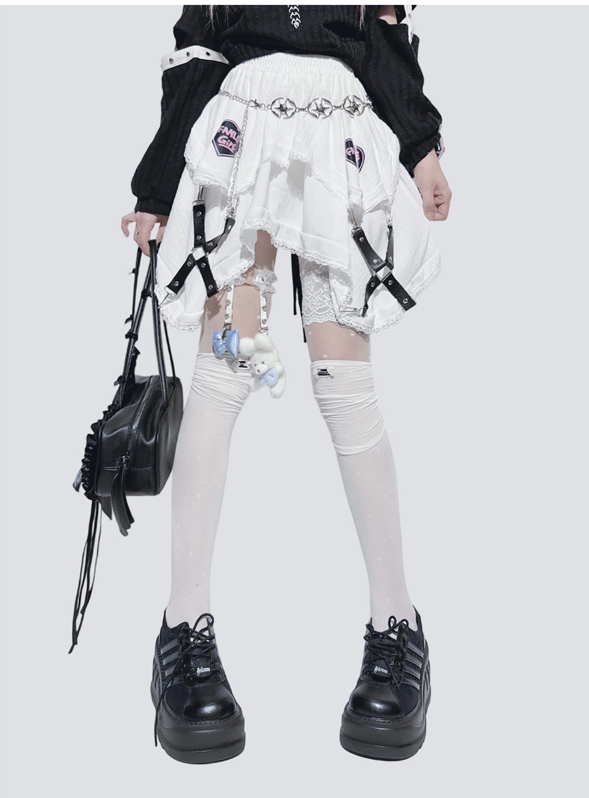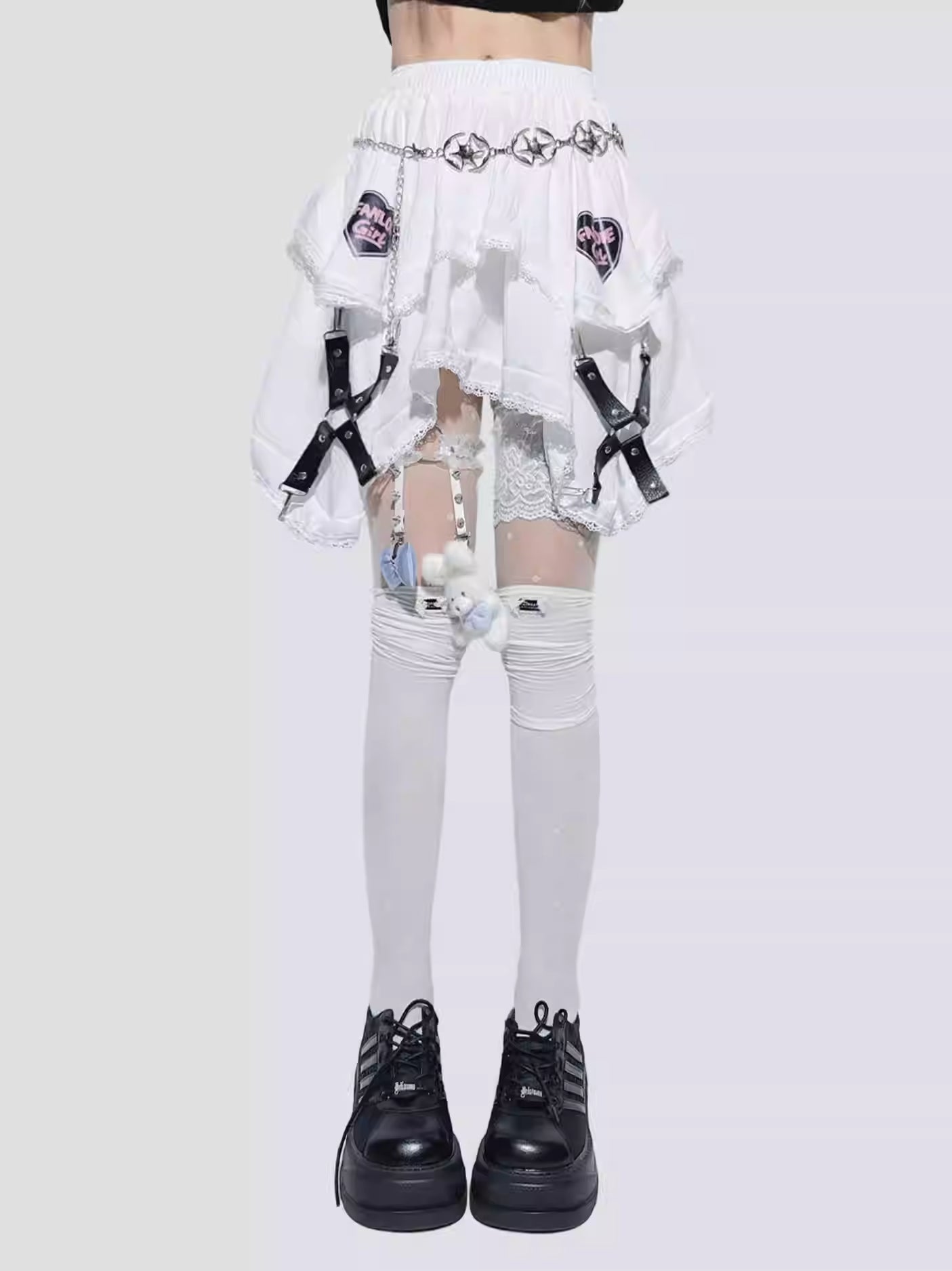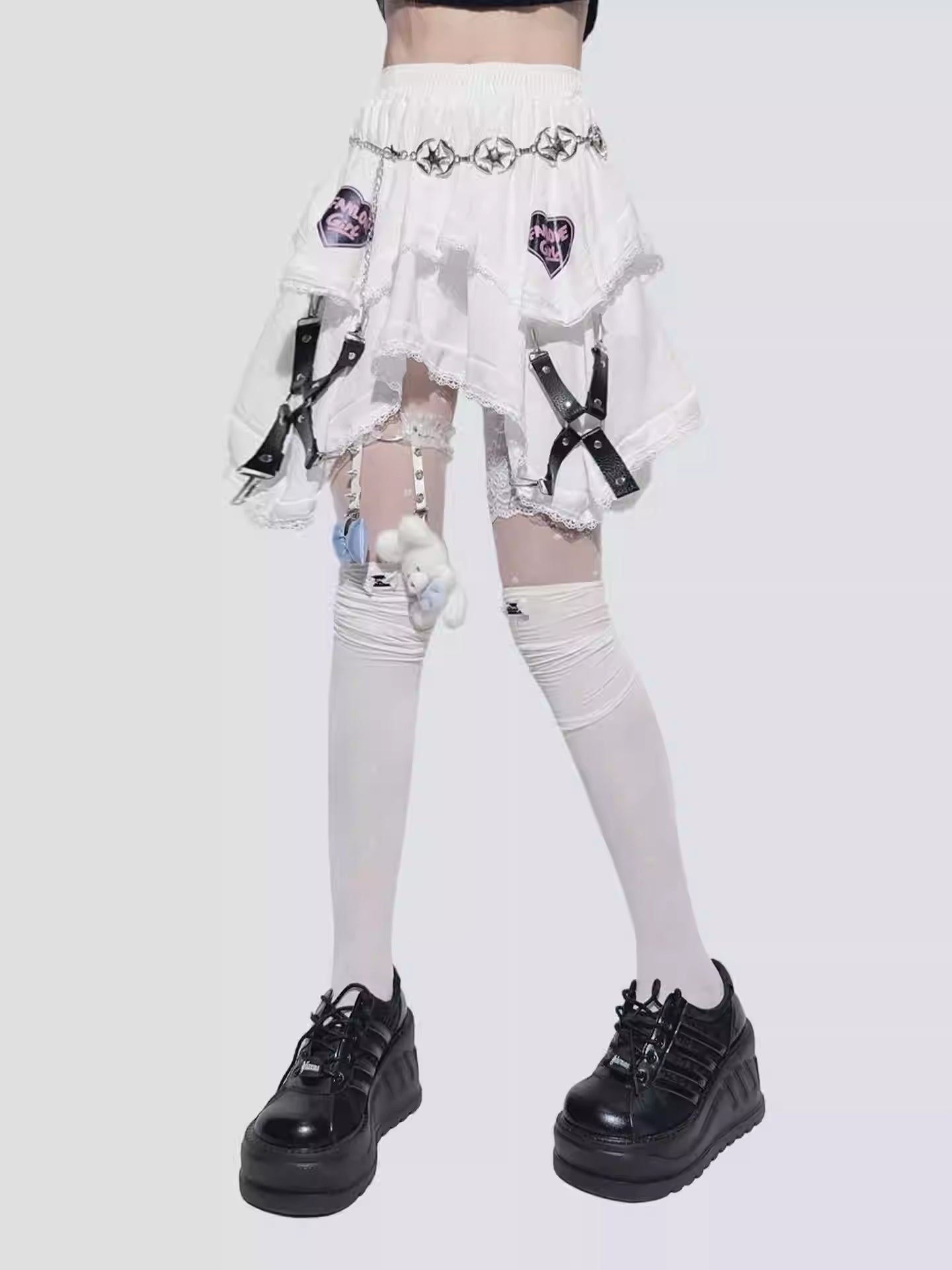 Embrace your sweet-and-edgy side with this stunning layered cake skirt! Featuring voluminous tiers and an asymmetrical hemline, it creates an eye-catching silhouette that's anything but ordinary. Delicate lace accents add a touch of elegance, while decorative belt straps bring that cool-girl edge. The elastic waistband ensures all-day comfort without sacrificing style. Perfect for anyone who loves mixing feminine charm with bold attitude!