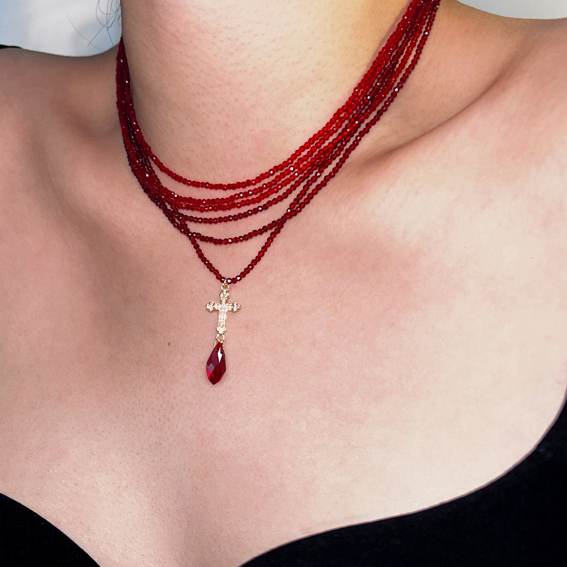 This vintage-style stacking necklace features delicate organza roses and cross charms. Its layered design creates a romantic yet edgy look, perfect for Halloween parties or gothic-inspired outfits.