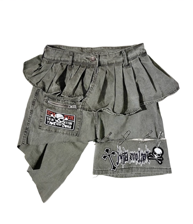 This edgy denim mini skirt is pure street style rebellion. Ruffled layers cascade down the front, while safety pins artfully connect the distressed patchwork sections underneath—creating an intentionally chaotic look that's anything but accidental. A skull motif adds attitude, and the jagged hemline keeps things unpredictable. Layer it over tights, pair with chunky boots, and own the room with confidence. Perfect for anyone who refuses to blend in.