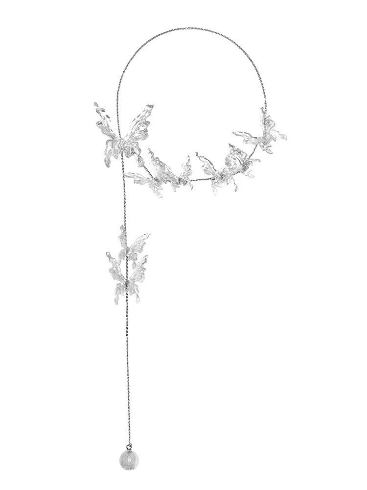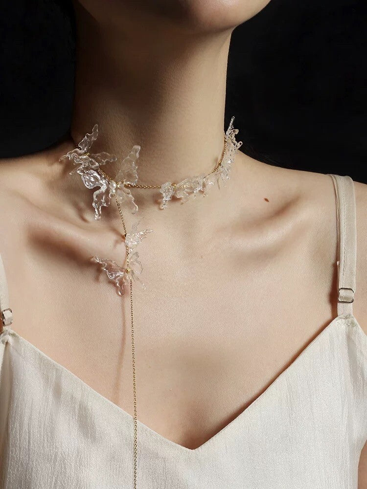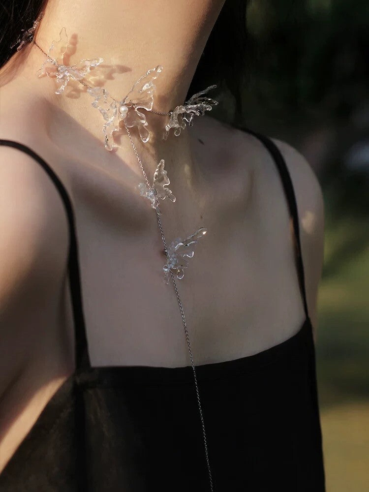 Crafted from radiant resin, floating glass bubbles and shell beads, this 'Sunset Dream Butterfly Necklace' embodies ethereal elegance with a delicate chinoiserie flair. Its fairy-like design adds a magical touch to vacations and evening parties, capturing light with every movement.
