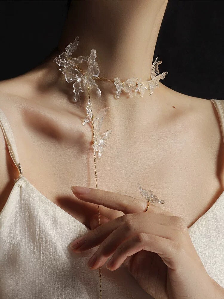 In nature, a butterfly emerging from its cocoon symbolizes tenacity and the yearning for freedom. The designer skillfully captures this essence in jewelry. The butterfly earrings and necklace sparkle in the sunlight, resembling the fairies of nature.