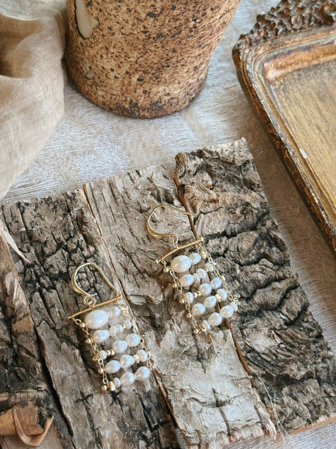 Crafted from luminous freshwater pearls and 14K gold-plated silver, these vintage-style earrings capture the soft glow of twilight clouds. Their elegant design and lightweight feel make them perfect for both daily wear and special occasions like dates or parties.