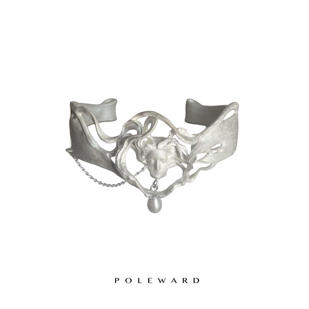 This open bangle features a bold, sculptural design inspired by mythical sirens. Its fluid curves and silver finish create a statement piece that blends organic elegance with symbolic depth—perfect for those who embrace unique, art-driven jewelry.
